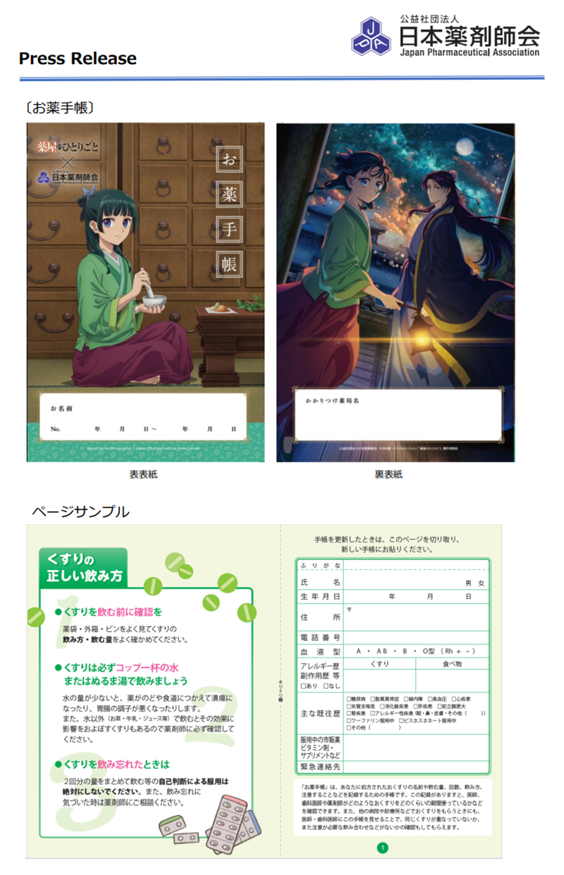 薬屋のひとりごとコラボお薬手帳入荷いたしました。数に限りがございますので、おひとりにつき、1冊のご提供となります。
